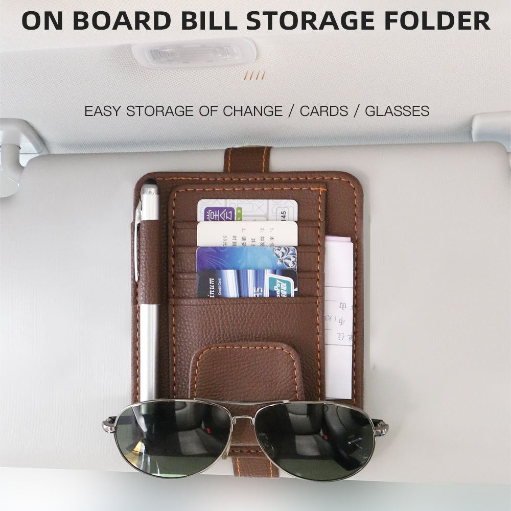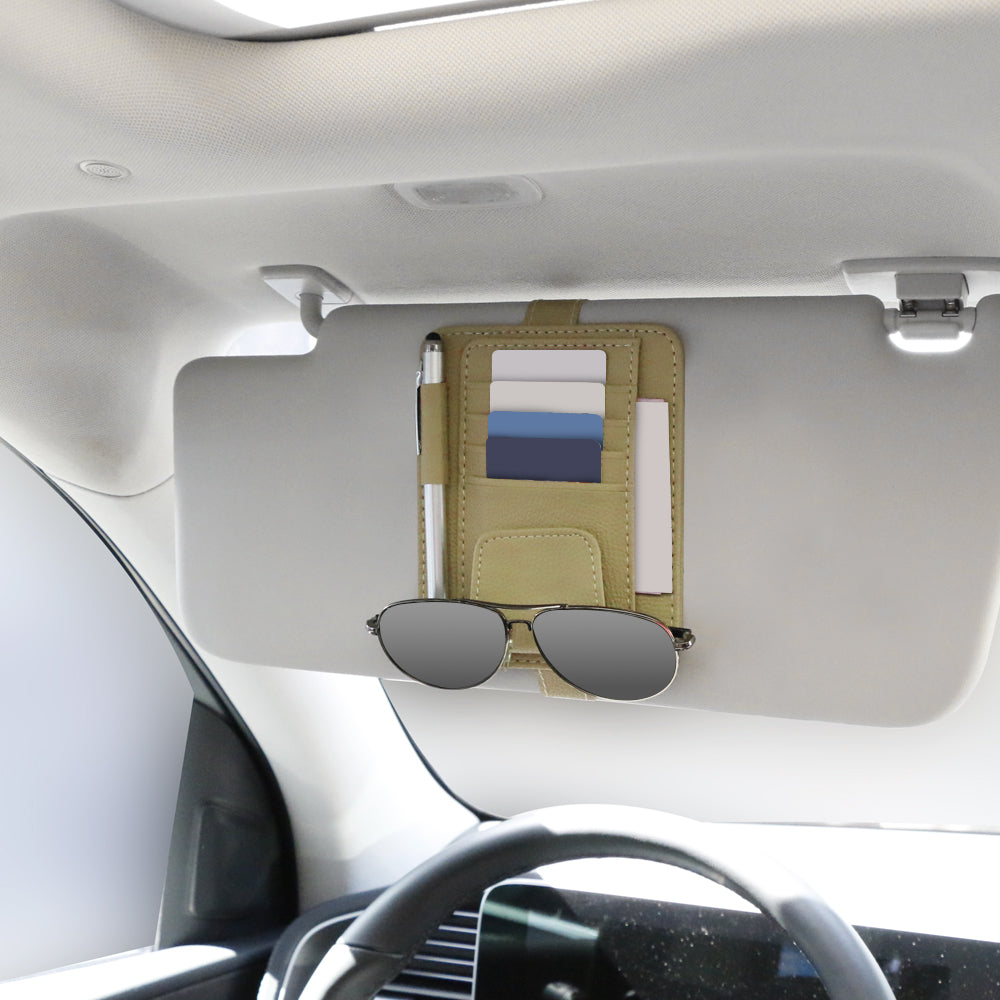 منظم واقي الشمس للسيارة - حامل نظارات متعدد الجيوب من الجلد الصناعي مع مساحة لتخزين البطاقات والأقلام والفواتير