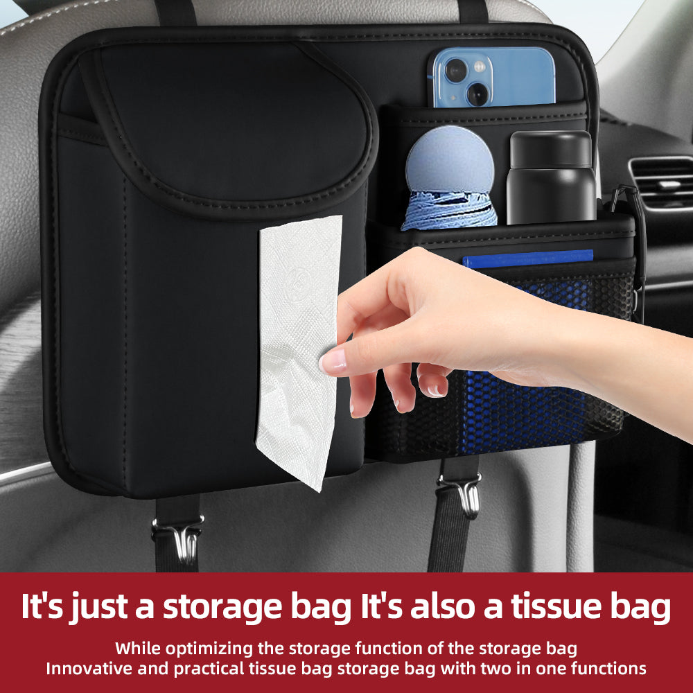 Multifunctional Backseat Car Organizer with Tissue Box & Hooks – Rear Seat Storage Bag for Road Trips | Black